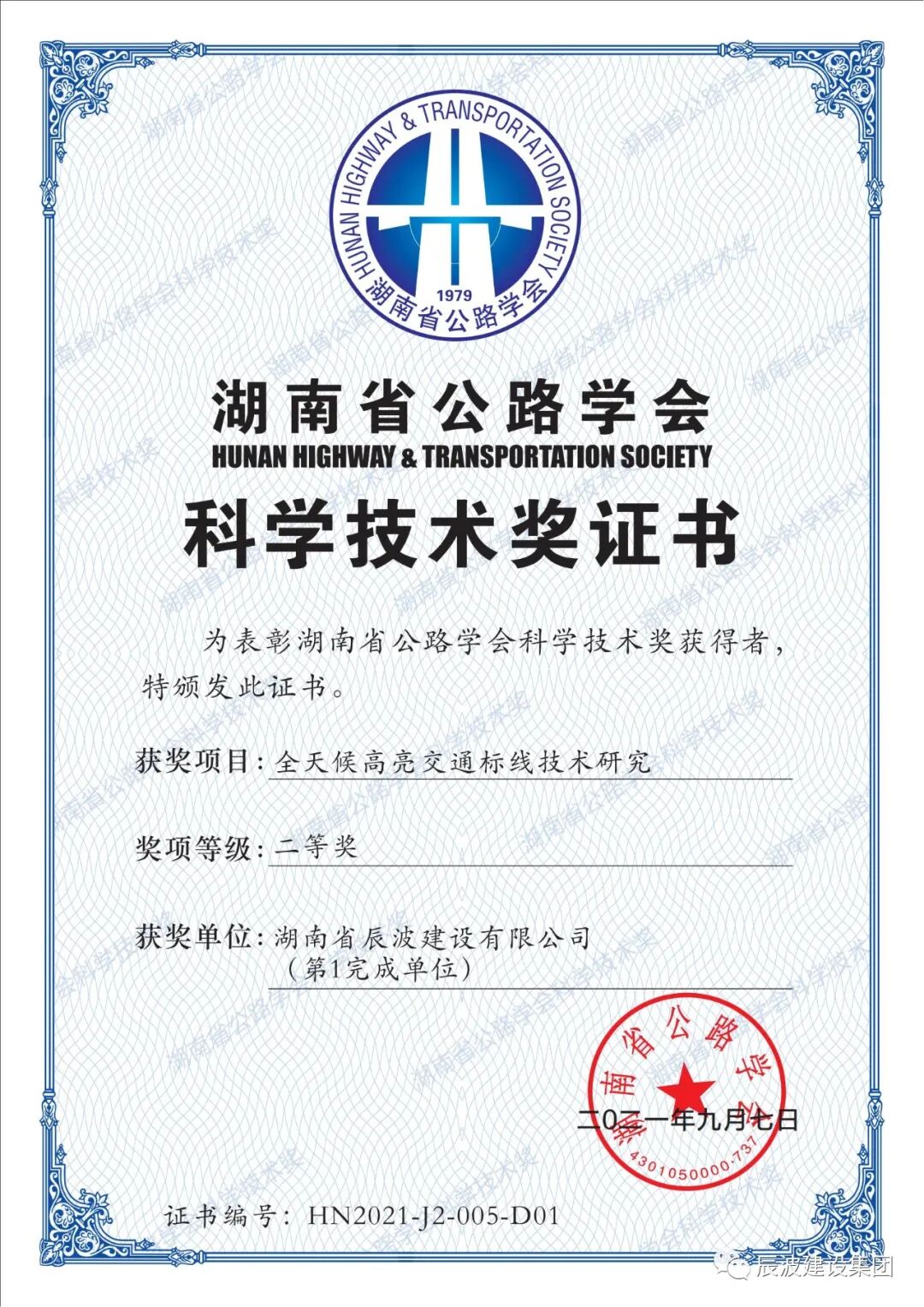 近日,根据《湖南省公路学会科学技术奖奖励办法》及《实施细则》等有关文件的规定和要求,经专家评审会评审,并挂网经常务理事会和驻会理事长办公会议审议通过,湖南省公路学会对2021年度“湖南省公路学会科学技术奖”予以了公布,按参评项目评选出一等奖6项,二等奖5项,三等奖2项。其中,长沙市邵阳商会执行会长单位湖南省辰波建设有限公司独立开发研究的“全天候高亮交通标线技术研究”荣获二等奖。