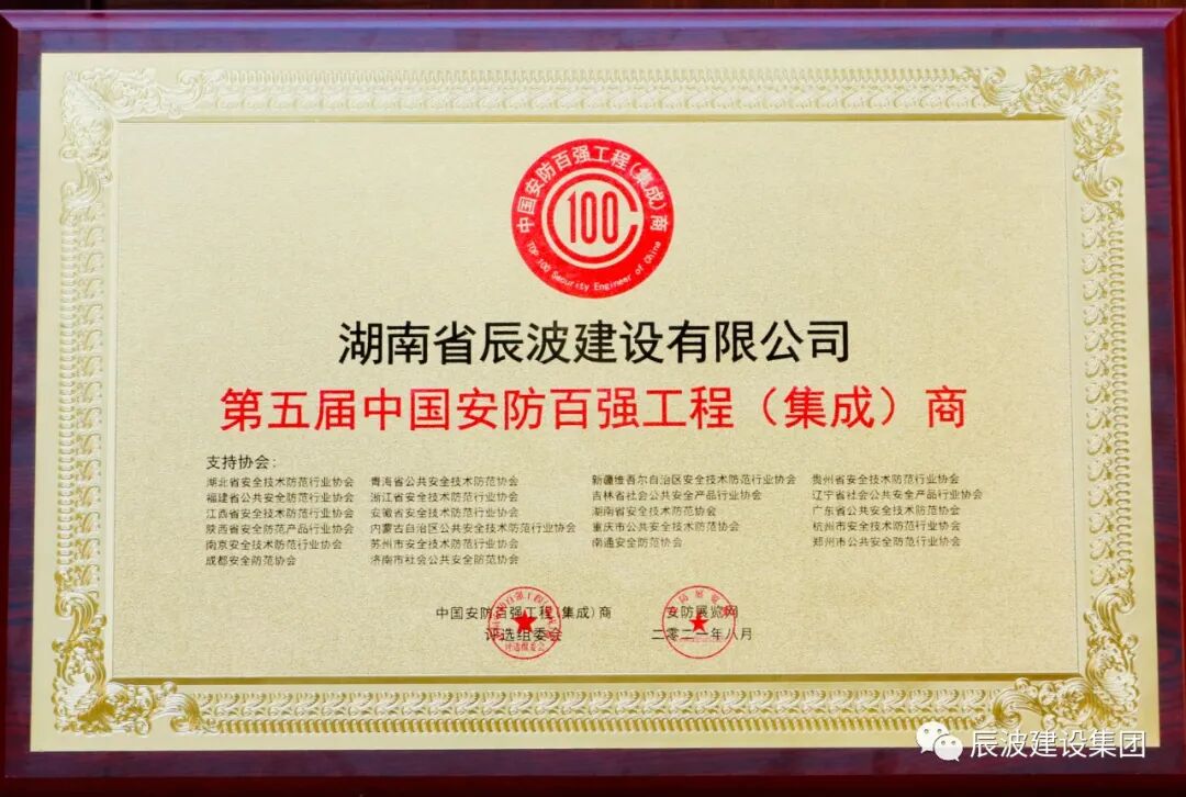 获奖现场 据悉,这是辰波建设第三次荣膺该项殊荣,是中国安防行业对辰波建设安防版块综合实力的又一次充分肯定。一直以来,公司积极参与推进安防行业发展,重视科研创新,不断提高业务水平,为推动中国安防行业的可持续发展贡献自己的力量。 近年来,辰波建设在省、市、区政府及上级主管部门的正确领导下,坚持以习近平新时代中国特色社会主义思想为指导,坚定不移走高质量发展之路,稳扎稳打,公司各经营版块捷报频传。 随着国家“一带一路”“中部崛起”“长沙武汉南昌三位一体发展”和湖南省“三高四新”战略的深入推进,辰波建设必将进一步集聚和放大企业优势,激发更多发展活力和动能。在优化产业布局、拓展合作渠道方面,紧紧抓住中部地区的资源禀赋和市场机遇,顺势而为、乘势而上,在推动平安湖南创建,加快智慧城市建设、加强行业交流合作等方面继续做出更大贡献,在融入湖南高质量发展、参与国家中西部建设,打造更具核心竞争力的科技创新建设高地等方面谱写新篇章,展现新作为。
