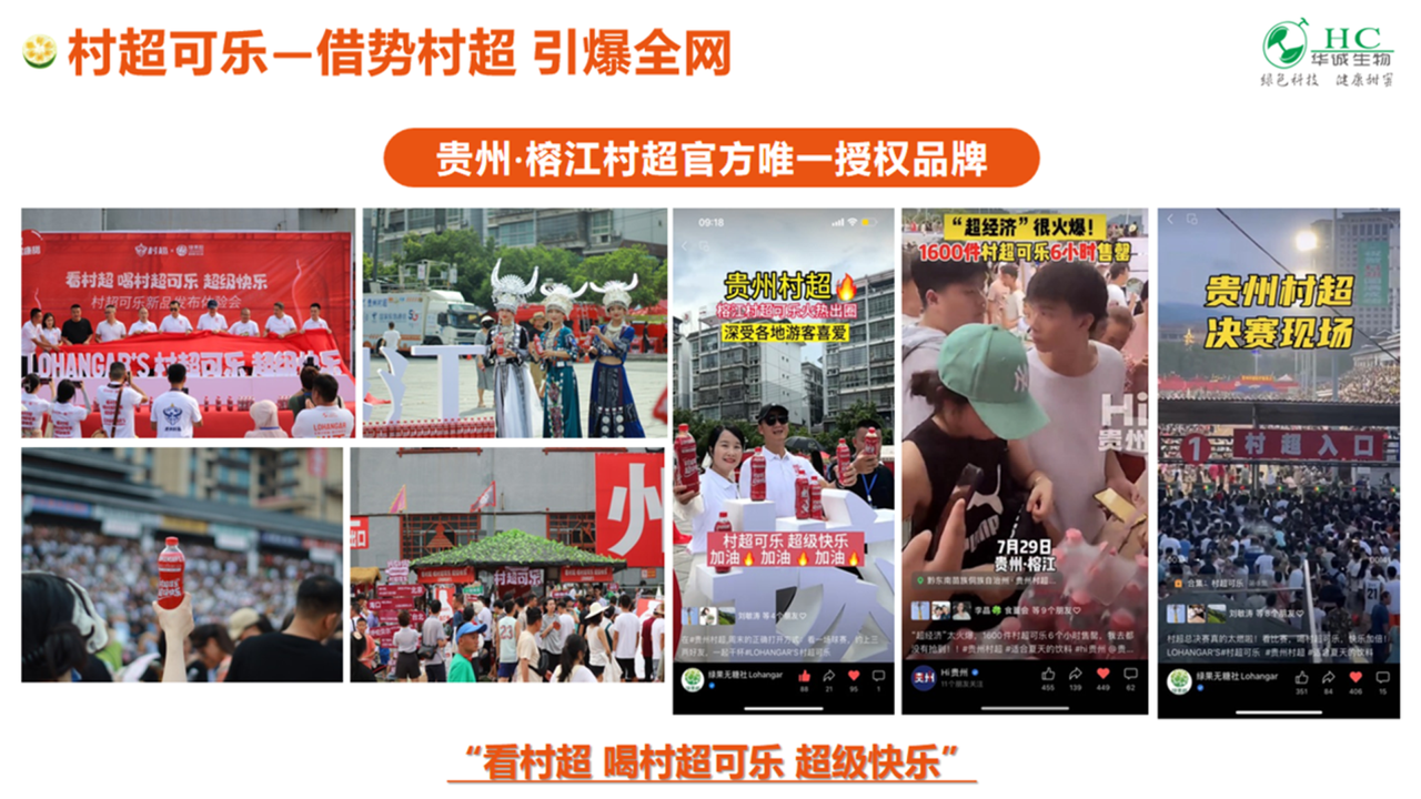 2023年,华诚生物与贵州村超联手,从无到有打造“LOHANGAR'S村超可乐”品牌,实现业内“减糖不减甜”新的行业样板与价值标杆。联名款“LOHANGAR'S村超可乐”一经上市,就成为中国消费者受欢迎的国民健康可乐,引领无糖可乐健康消费新浪潮。