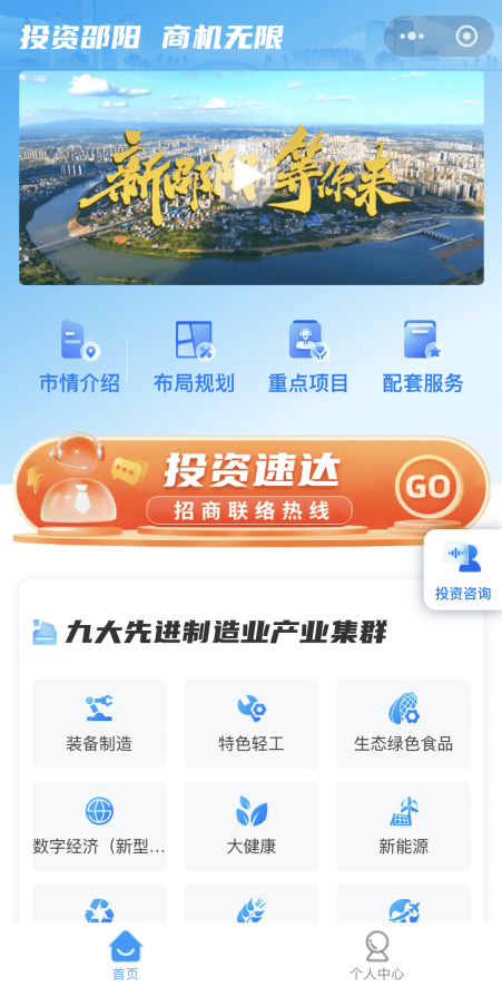 “宝码荟”小程序内容丰富,包括市情介绍、布局规划、重点项目、配套服务、九大先进制造业产业集群、主要平台和招商联络热线等7个板块,为用户和企业提供全方位、深层次的线上招商服务。全面展示邵阳市的地理位置、历史文化、经济发展状况、交通网络等基本信息,帮助用户快速了解邵阳的基本情况。