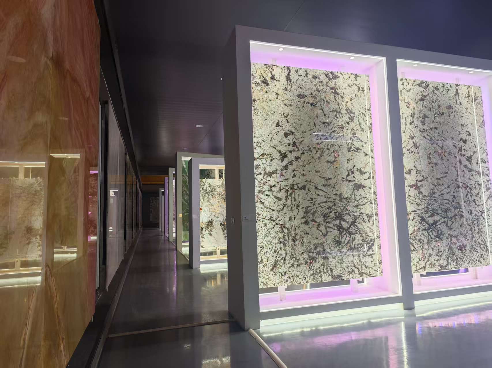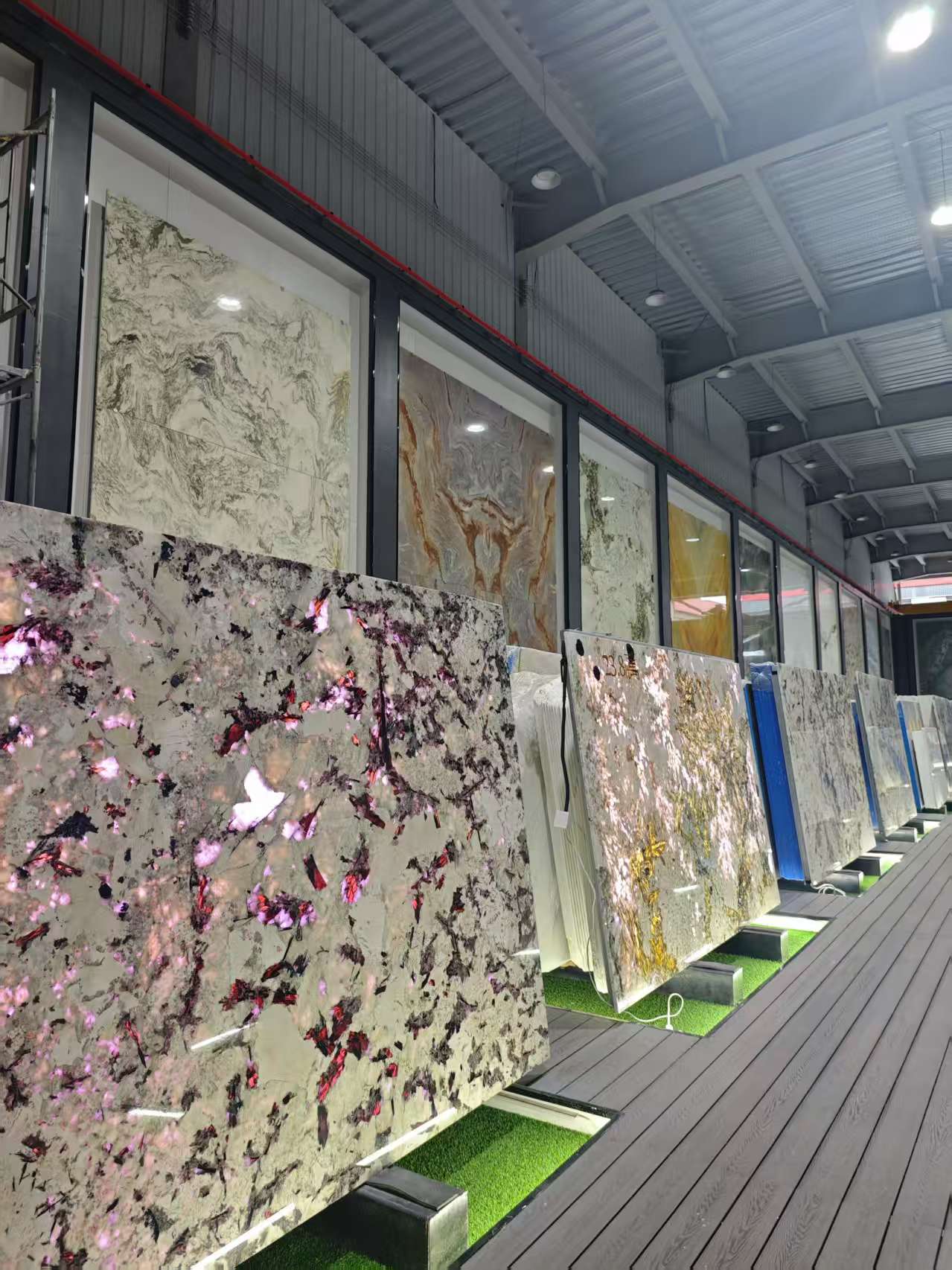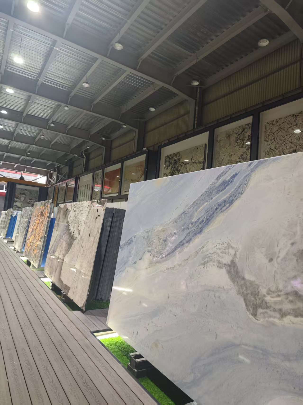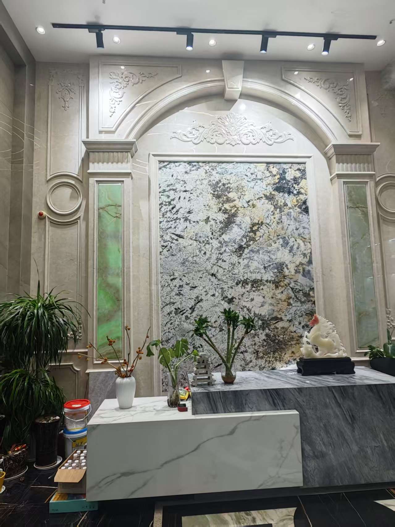 在鑫达石材的展示空间中,奢石已成为当前业务的核心板块与主打方向。店内陈列的背景墙、楼梯花纹板等产品,均属于高端奢石系列。正如总经理李和珍所强调:“其实现在奢石才是我们的主要板块。”近年来,“无时不豪宅,无石不成奢”正成为高端家居设计的新趋势,奢石以其独特的天然纹理、稀缺性和艺术美感,成为提升空间格调的点睛之笔。目前市场上主流的奢石板材规格约为3米×2米,面积约6平方米,单片价格普遍在1万至2万元之间,兼具收藏价值与装饰功能,广泛应用于豪宅背景墙、奢石玄关、餐桌、茶台、餐边柜等多种场景,不仅彰显居所的品位与气质,更体现了业主对品质生活的极致追求。