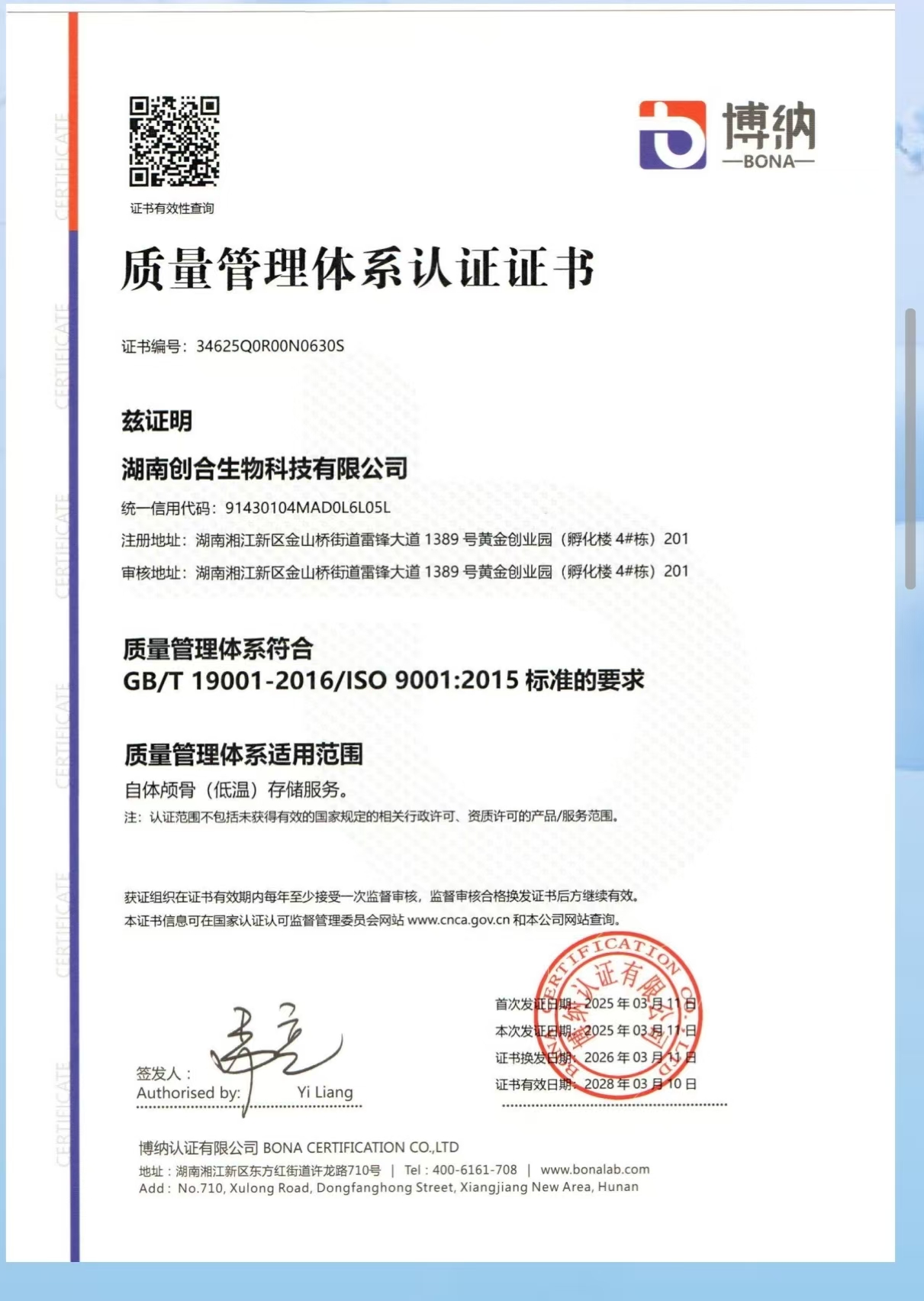 湖南创合生物科技有限公司坐落于湖南湘江新区黄金创业园,以“专注医学低温储存,保障患者生命健康”为核心使命,专业提供自体颅骨深低温存储服务,服务网络已覆盖近百家医疗机构。公司建成整体十万级、局部万级洁净标准的骨库基地,全面遵循ISO9001质量管理体系要求;深耕技术研发与创新转化,聚焦深低温保存核心技术攻关,研发专用保存培养液及骨诱导、骨传导相关修复技术,同时与多家高等医学院校开展产学研协同创新及科研横向课题合作,构建起“临床需求-技术研发-产业转化”的完整闭环,是国内自体骨深低温保存领域的高新技术标杆企业。