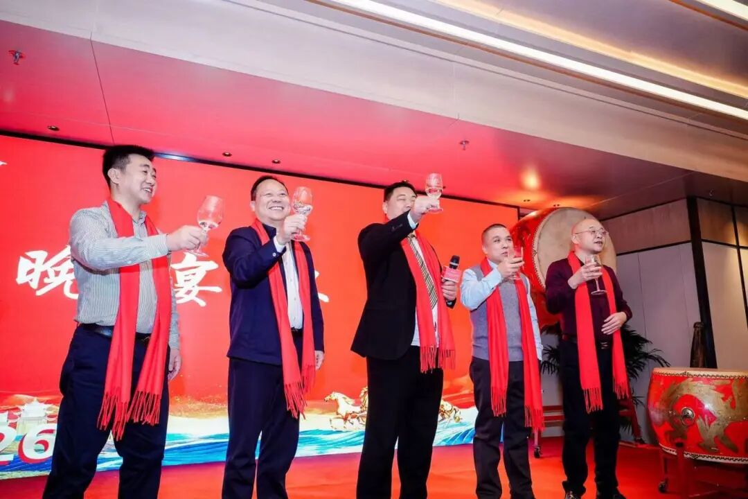 晚宴环节在喜庆的开场舞蹈后正式开始。十组历任组长上台举杯祝酒,共贺新春。现场气氛热烈融洽,“抢红包”、“策马扬鞭”、“你比我猜”、“原地踏步”等互动游戏穿插进行,点燃全场热情。