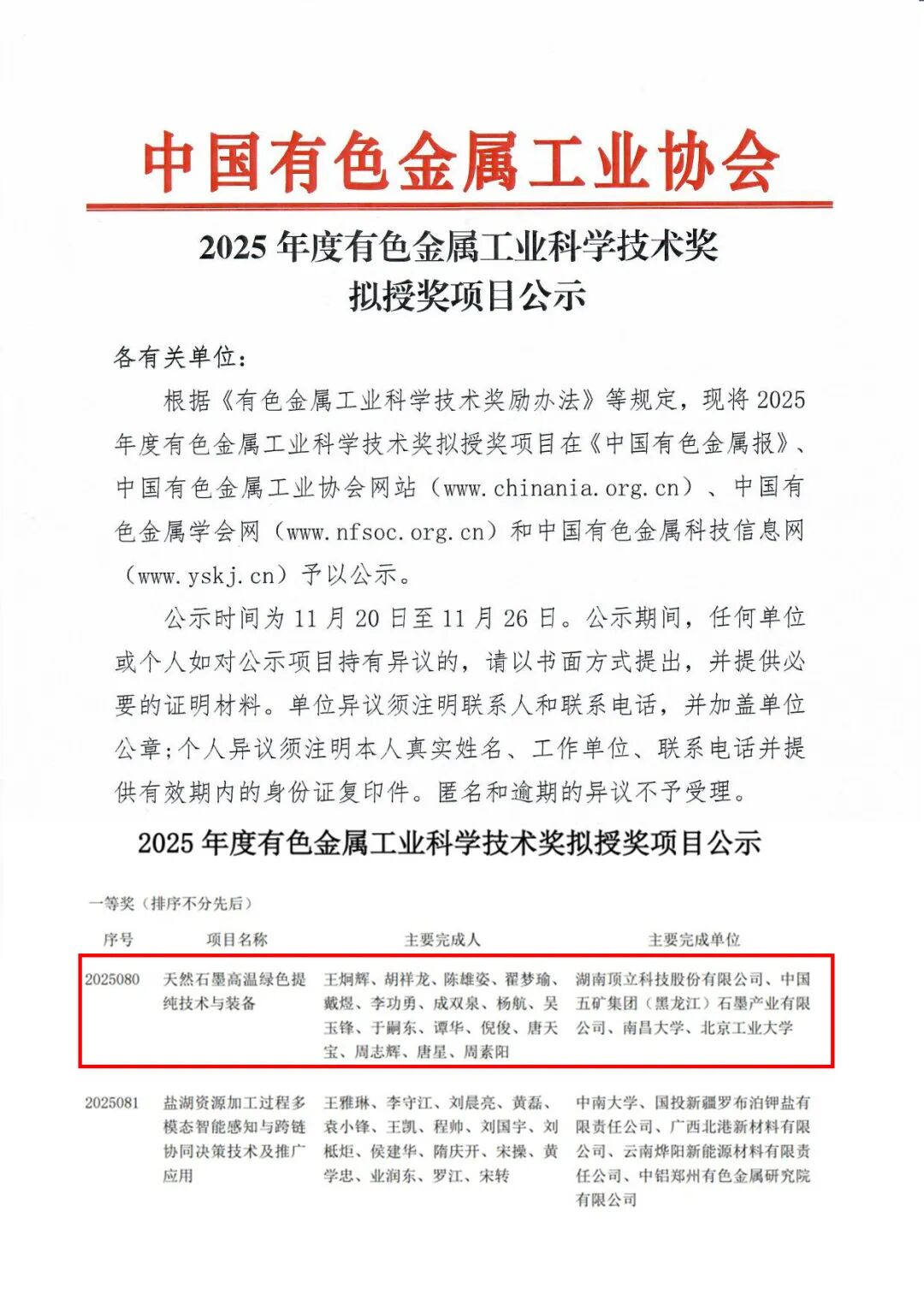 近日,中国有色金属工业协会公示了“2025年度有色金属工业科学技术奖”拟授奖项目,我会优秀企业——湖南顶立科技股份有限公司牵头联合攻关的“天然石墨高温绿色提纯技术与装备”成果荣获一等奖!这一奖项是中国有色金属行业的最高科技荣誉,标志着我国在高端石墨提纯领域取得了重大技术进展。